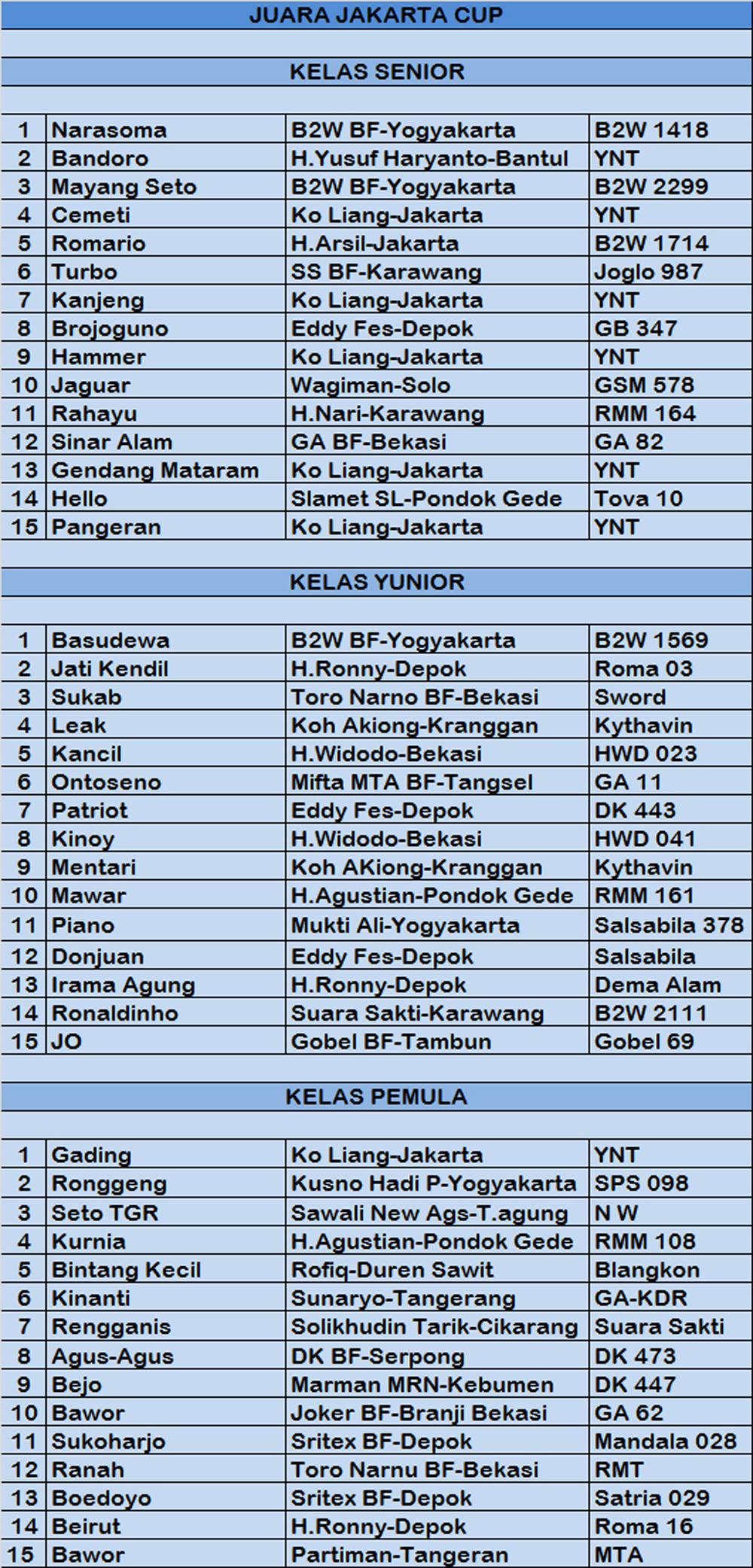 Sedangkan di kelas Pemula, masih memungkinkan nama-nama baru. Namun kali ini Gading, orbitan Ko Liang Jakarta akhirnya menjadi juara pertama di kelasnya. Derkuku produk YNT BF Bantul Yogyakarta ini seakan menajdi jago baru yang siap mengunci gelar sebagai pemegang posisi teratas di kelas Pemula.