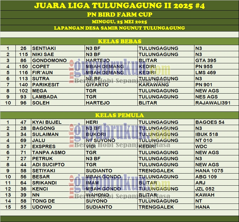 Memasuki putaran keempat, Liga Tulungagung semakin menumbuhkan semangat peserta untuk bisa meraih posisi paling depan daftar kejuaraan. Minggu, 25 Mei 2025 menjadi agenda pelaksaan liga yang rutin digelar setiap bulan. Seperti pada kegiatan sebelumnya, acara kali ini tetap mengedepankan silaturrahmi antar sesama penghobi.